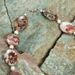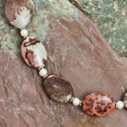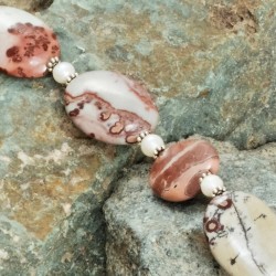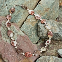 Gemustert wie ein "verrücktes Pferd" sind diese aus einer Art Kalkstein bestehenden flachen Ovale. Jeder Stein trägt eine individuelle Zeichnung! Zusammen mit weißen Zuchtperlen und winzigen Blümchen aus Bali-Silber (925er Silber) bilden sie eine fröhliche und doch edel anmutende Halskette. Die Steine sind ca. 25x18mm groß und wurden zum Schutz vor Umwelteinflüssen und für einen schönen Glanz mit einem Klarlacküberzug versehen. Der Verschluß in Form einer kleinen Schmecke besteht ebenfalls aus Bali-Silber. Die Halskette ist ca. 54cm lang.
