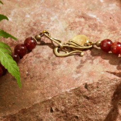 Chalis Well ist eine geheimnisumwitterte heilige Quelle am Fuße des Glastonbury Tor in der englischen Grafschaft Somerset. Der Sage nach soll dort der heilige Gral vergraben sein, der das Wasser der Quelle blutrot färbt und ihm Heilkräfte verleihen soll. Der Brunnendeckel von Chalis Well ist mit dem Symbol "Vesica Piscis" verziert, zwei ineinandergreifenden Kreisen, welche die Geburtsstunde der Schöpfung und die Verbindung von Gegensätzen symbolisieren. ... Das Motiv vom Brunnendeckel der heiligen Quelle ziert auch das Amulett in dieser besonderen Halskette. Die darin verarbeiteten edlen Steine – Hessonit, Tigereisen und facettierter Mondstein – spiegeln die rötliche Farbe des (eisenhaltigen) Quellwassers wider. Bronzefarbene Metallkappen und -kügelchen sorgen für eine edle Ausstrahlung des Schmuckstücks. Die Halskette ist ca. 56cm lang und wird von einer filigran verzierten bronzefarbenen Hakenschließe gehalten. Die Tigereisen-Kugeln messen als größte Perlen 10mm, das Amulett hat einen Durchmesser von 30mm.