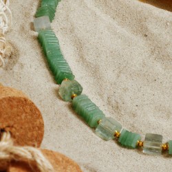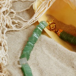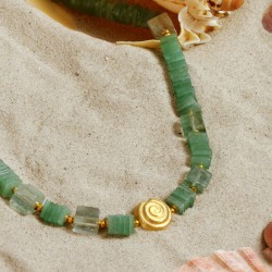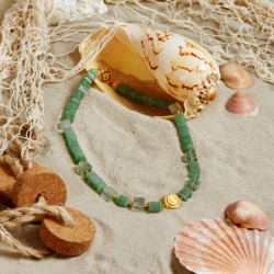 ...ist eine Meernymphe aus der griechischen Mythologie. Sie nahm den schiffbrüchigen Odysseus auf ihrer Insel Ogygia auf und hielt ihn dort sieben Jahre bei sich fest. ... In den Farben des Meeres erstrahlt diese erlesene Halskette. Ich habe sie aus zart-grünen Fluorit-Würfeln und flachen quadratisch geschnittenen Aventurin-Scheiben gearbeitet. Eine Muschel aus vergoldetem Metall mit gebürsteter Oberfläche bildet den Blickfang und sorgt neben winzigen vergoldeten Metallscheibchen und -kügelchen für eine edle Ausstrahlung des Schmuckstücks. Die Kette ist knapp 47cm lang und wird von einem großen vergoldeten Federring-Verschluß gehalten. Die Fluorit-Würfel haben eine Kantenlänge von 10mm, die Aventurin-Scheiben messen 8x8mm.