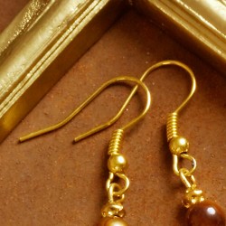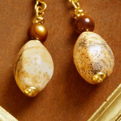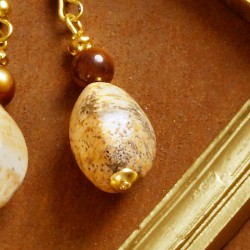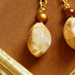 Die lebhafte Zeichnung der Oberfläche, die ein wenig an stilisierte Landschaften erinnert, verhelfen dem Landschaftsjaspis zu seinem Namen. ... Dreieckige Ovale aus beige-braun gesprenkeltem Landschaftsjaspis habe ich zusammen mit dunkelbraunen Austershell-Kugeln in diesen Ohrringen verarbeitet. Winzige vergoldete Metallschalen und -kügelchen unterstreichen die warmen Farben der Perlen und verleihen den Schmuckstücken eine edle Ausstrahlung. Die Ohrringe an schlichten vergoldeten Ohrhaken sind knapp 5cm lang. Die größten Perlen messen 15x10mm.