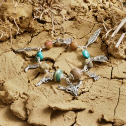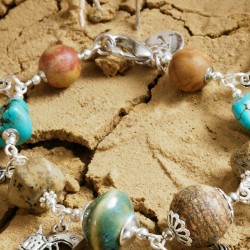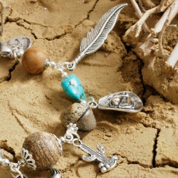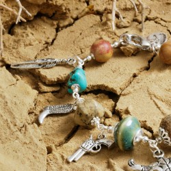 Als "Wilder Westen" sind die westlich des Mississippi gelegenen Gebiete der heutigen USA, die während der Pionierzeit des 19. Jahrhunderts von Trappern und Siedlern "erobert" wurden, bekannt. Neben Cowboys und Indianern avancierten Revolverhelden, Sheriffs und Planwagentracks zu Sinnbildern des "Wilden Westens" – Klischees, die bis heute nicht an Gültigkeit verloren haben. ... In dem hier gezeigten Bettelarmband vermitteln versilberte Metallanhänger in Form von Cowboyhut und Cowboystiefel, Indianerfedern, Revolver, Bisonschädel und Kaktus das Flair vom "Wilden Westen". Die Perlen des Armbands habe ich einzeln auf versilberten Kupferdraht aufgezogen und mit versilberten Metallkappen und -kugeln versehen. Sie bestehen aus Flower- und Landschafts-Jaspis, versteinertem Holz, Türkis sowie Keramik und erinnern in ihren Farben an die weite Landschaft der neu besiedelten Gebiete. Das Armband ist 20cm lang und wird von einem versilberten Karabiner verschlossen. Die größte Perle hat einen Durchmesser von 14mm, der größte Anhänger mißt ca. 30x30mm.