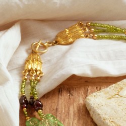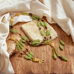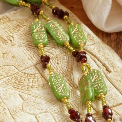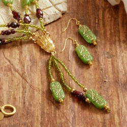 Eine der bekanntesten Persönlichkeiten des Alten Ägypten ist wohl Cleopatra. Sie herrschte 51 bis 30 v.Chr. als Königin und letzter weiblicher Pharao über das ägyptische Ptolemäerreich. Um ihren Einfluß gegenüber der Weltmacht Rom zu stärken, wurde sie die Geliebte von Gaius Julius Caesar und Marcus Antonius. ... Einer ägyptischen Königin würdig ist dieses aufsehenerregende Schmuck-Set. Zwischen grünen, mit goldenen Hieroglyphen verzierten böhmischen Glasperlen und farblichen passenden Rocailleperlchen setzen tiefrote Granatsplitter einen farblichen Akzent. Für majestätischen Glanz sorgen vergoldete Spacer und Perlenkappen sowie Metallelemente, die in Form von Lotusblüten golden funkeln. Die Halskette ist ca. 55cm lang, der Anhänger mißt noch einmal 12cm. Das Armband hat eine Länge von 19,5cm und die Ohrringe messen 4,5cm. Kette und Armband werden jeweils von einer vergoldeten Ring-Stab-Schließe gehalten. Die größten Perlen sind ca. 25mm lang.