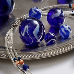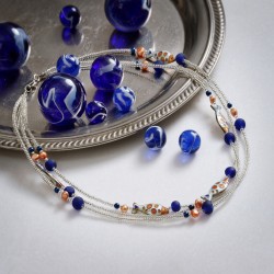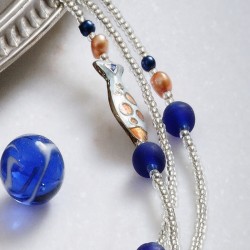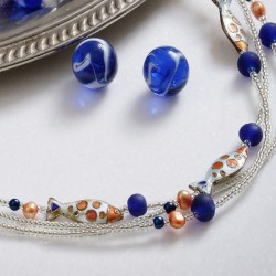Kleine Koi aus emailliertem Kupfer (Cloisonné-Perlen) bilden mit orangefarbenen Süßwasserzuchtperlen, matten und glänzenden blauen Glasperlen sowie transparenten, mit Silbereinzug versehenen, Rocailles ein harmonisches Ensemble. Die 3-reihige Kette wird von einem kleinen versilberten Karabiner verschlossen. Die "Fischli", als größte Perlen, sind ca. 26x11mm groß.