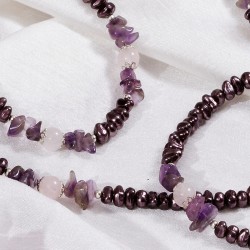 Schmuck-Set aus violett gefärbten Gablonzer Glasperlen, zartrosa Rosenquarz-Kugeln sowie hell-violetten Amethyst-Splittern, mit versilberten Metallelementen und rhodinierten Kugelschließen, Halskette ca. 82cm, Armband ca. 22cm lang