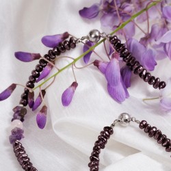 In einen "Farbrausch" verschiedener Lila-Töne wird man von diesem Schmuck-Set, bestehend aus einer ca. 82cm langen Halskette und einem knapp 22cm langen Armband, versetzt. Ich habe die schmucken Stücke aus violett gefärbten, schimmernden Gablonzer Glasperlen, zartrosa Rosenquarz-Kugeln sowie hell-violetten Amethyst-Splittern gefertigt. Mittendrin blitzen versilberte Metallkügelchen und Perlenkappen auf. Als Verschluß dienen rhodinierte Kugelschließen. Die Halskette kann – je nach Tageslaune – einfach, geknotet oder doppelt gelegt getragen werden.