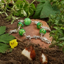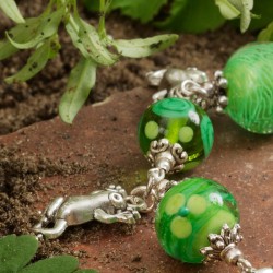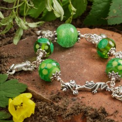 Beim Werkeln in meinen Blumenrabatten fiel mein Blick neulich auf einen kleinen Stein. Als ich ihn aufheben wollte, sprang der Stein beiseite und "enttarnte" sich dadurch als winziges Fröschlein. ‒ Was im Garten nicht so alles "kreucht und fleucht"! ... Wieder im Atelier fertigte ich das hier gezeigte Bettelarmband an. Es besteht aus fünf individuell von Hand gefertigten Glasperlen, die durch verschiedene Grüntöne sowie ihr fröhliches Dekor bezaubern. Ich habe sie einzeln auf versilberten Schmuckdraht gezogen, mit Perlenkappen "garniert" und durch silberfarbene Metallringe miteinander verbunden. In Erinnerung an die vorangegangene Szene mit dem "springenden Stein" habe ich fünf lustige Frosch-Anhänger an das Armband montiert. Das Schmuckstück ist ca. 18,5cm lang und wird von einer witzigen Hakenschließe in Form zweier sich "unterhakender" Fröschlein gehalten. Die größte Glaskugel hat einen Durchmesser von 16mm, die Frosch-Anhänger sind 23mm lang.