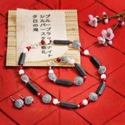 ...bezeichnet ein 17-silbiges japanisches Gedicht nach dem Schema "5-7-5 Silben". ... Zugegeben, dieses Schmuck-Set entspricht nicht ganz diesem Versmaß, dafür bezaubert es in den Farben schwarz, weiß und rot. Ich habe es aus roten und weißen Korallen-Kugeln, länglichen gewölbten Rechtecken aus mattiertem schwarzen Onyx und schwarz-weiß gestreiften Zebramuscheln gearbeitet. Die Kette ist 66,5cm lang und wer mag, kann das knapp 26cm lange Armband auch als Verlängerung der Kette einsetzen. Beide Stücke werden jeweils von einem versilberten Ring-Stab-Verschluß gehalten. Die Ohrringe an Sterlingsilber-Haken sind insgesamt 5,5cm lang.