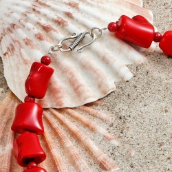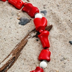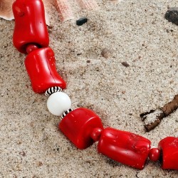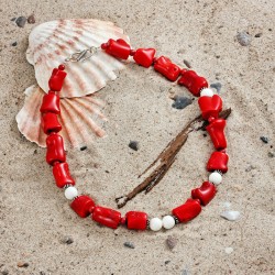 ...bedeutet auf japanisch "fein, elegant, schick", aber auch "eigentümlich, ausgefallen, sonderbar". – Und die großen polierten Stücke von roter Bambuskoralle, kombiniert mit weißen und roten Steinkorallen-Kugeln sowie kleinen Silberspacern sind in der Tat schick und ausgefallen zugleich. Diese üppige Kette, die von einer Silberschließe gehalten wird, ist ca. 49cm lang.