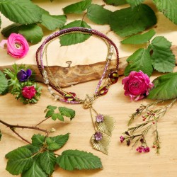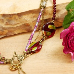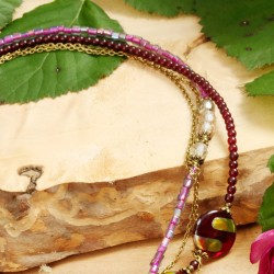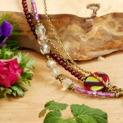 ...haben sich in diesem sehr vielseitig tragbaren Schmuckstück überall "versteckt": als Anhänger, als Detail im Verschluß oder in den kleinen bronzefarbenen Perlenkappen. ... Die Halskette habe ich vierreihig gearbeitet: die erste Reihe besteht aus granatroten Glasperlchen und kirschroten Glaslinsen, deren Oberflächen z.T. mit metallisch-schillernden Mustern verziert sind. Eine weitere Reihe habe ich mit winzigen violetten Glaswürfelchen und facettierten transparenten Glaskugeln bestückt. Die größeren Glasperlen auf diesen beiden Reihen habe ich dabei mit Perlenkappen in Blütenform sowie kleinen Kügelchen aus bronzefarbenem Metall "eingerahmt". Die Kettenreihen drei und vier bestehen aus feinen bronzefarbenen Metallkettchen. Sie können diese Halskette einerseits als 4-reihiges Schmuckstück von 48cm Länge tragen. Sie können das schmucke Stücke aber auch als 96cm Longkette tragen, wobei der Stab des Knebelverschlusses im Nacken plaziert wird und dessen blütenverzierter Ring als Anhängerschlaufe dient. In jedem Fall ist das aus bronzefarbenen Metallblättern und zart-violetten Blütenkelchen bestehende Anhängerpaar von insgesamt 13cm Länge, das an feinen Metallkettchen baumelt, der "Hingucker" in diesem Schmuckstück.