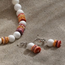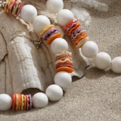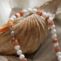 Im 19. Jahrhundert wurde die Bezeichnung Liaison für eine Liebesbeziehung geprägt. Der Begriff wurde dem gleichbedeutenden franz. Wort liaison entliehen, welches auf das lateinische ligatio = Verbindung zurückgeht. ... In dem hier gezeigten Schmuck-Set gehen strahlend weiße Kugeln aus dem Perlmutt der Riesenmuschel und fröhlich-bunte Scheiben aus den Schalen der Königsmantel-Muschel eine bezaubernde Liaison ein. Die Perlen, die alle einen Durchmesser von ca. 10mm haben, wirken dabei so edel und harmonisch, daß ich bewußt auf "glitzernde Zutaten" verzichtet habe. Die Halskette ist 41cm lang, das Armband mißt 20cm. ‒ Wer mag, kann beide Stücke zu einer langen Kette kombinieren, indem er sie mittels der versilberten Kugelschließen miteinander verbindet. ;) ‒ Die Ohrringe, an versilberten Klappbrisuren montiert, sind 4cm lang.