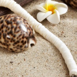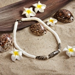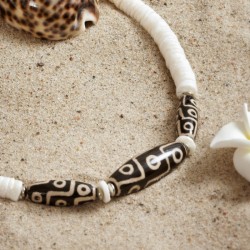 Einer im Himalaja bekannten Legende zufolge ließ ein guter Geist, der die Menschen vor bösen Dämonen beschützen wollte, dZi-Perlen vom Himmel regnen. Wer diese Perlen fand, war vor Unheil und der Macht der Dämonen geschützt, da die Perlen immer ein offenes Auge des guten Geistes bei sich hatten. So kommt es, daß die dZi-Perle auch "Himmelperle" genannt wird. Je mehr "Augen" eine solche "Himmelsperle" hat, desto wertvoller ist sie. ... Blickpunkt in dieser Halskette sind die drei tibetischen "Himmelsperlen" aus gebeiztem Karneol. Umgeben werden diese "magischen Steine" von unzähligen weißen Minkmuschel-Scheiben. Die größte Perle mißt ca. 40mm, die Kette ist ca. 52cm lang. Als Verschluß dient ein versilberter Toggle.