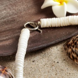 exotische Halskette aus weißen Minkmuschel-Scheiben und drei tibetischen "Himmelsperlen" aus gebeiztem Karneol, mit versilberten Metallelementen und versilberter Toggle-Schließe, ca. 52cm lang